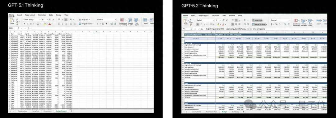 这是GPT-5.1 Thinking和GPT-5.2 Thinking做人力资源表格的对比: