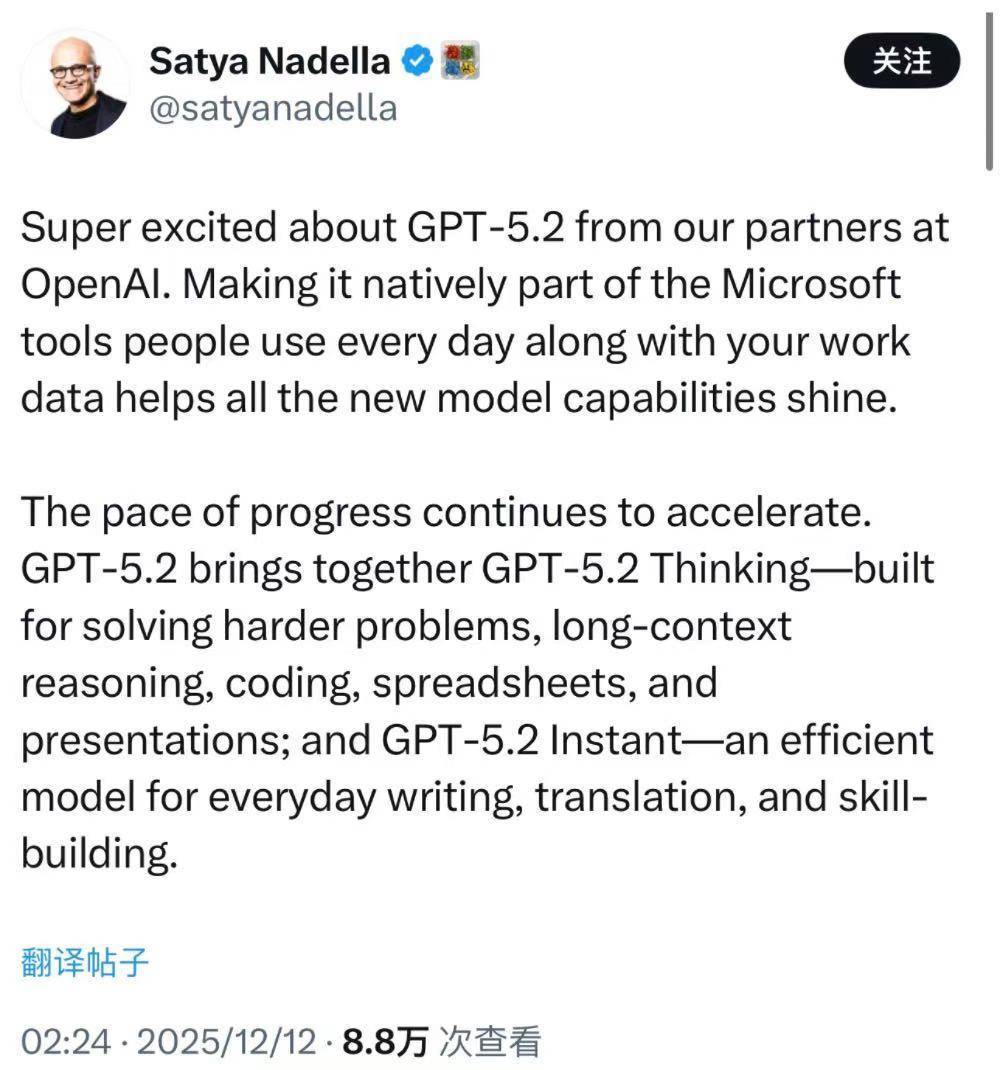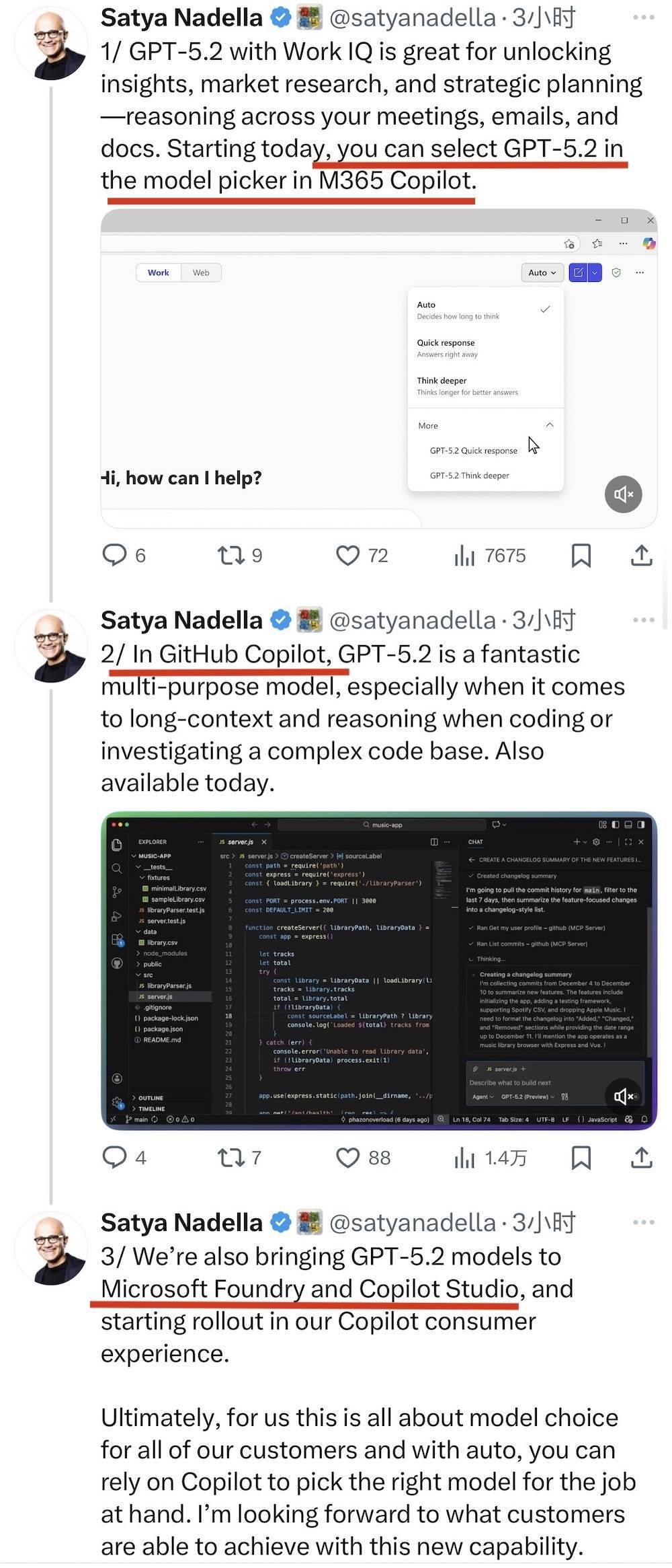 与此同时,微软董事长兼CEO Satya Nadella宣布,GPT-5.2将全面进入Microsoft 365 Copilot、GitHub Copilot与Foundry等产品体系。