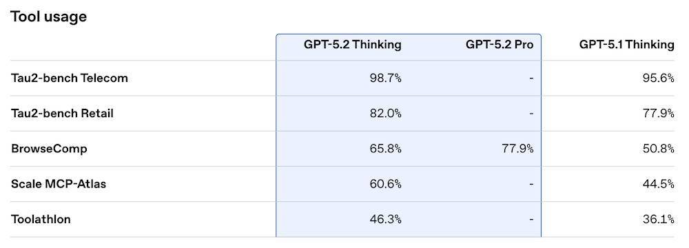 GPT-5.2 Thinking在Tau-2 Bench Telecom中达到98.7%的最高得分,在零推理模式下也大幅领先上一代,在更高噪声的Retail场景中准确率从77.9%提升至82%。在更通用的工具链评估BrowseComp中,GPT-5.2 Thinking达到65.8%,Pro版本达到77.9%,亦高于GPT-5.1的50.8%。