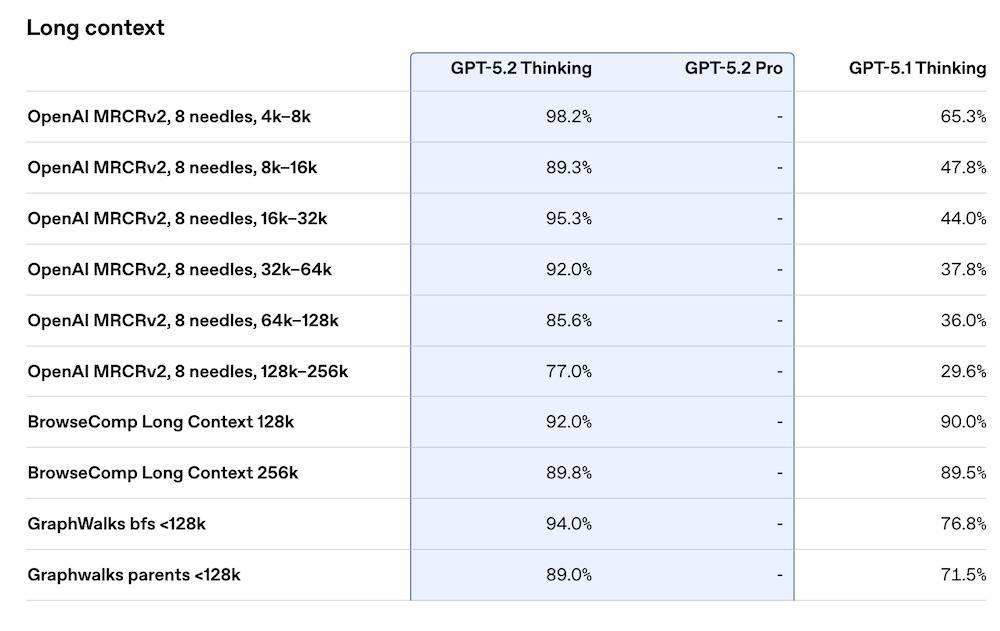 三、在长上下文与视觉理解,GPT-5.2全面增强在长上下文能力上,GPT-5.2 Thinking在OpenAI MRCRv2中全面领先上一代,在8 needles测试中从4k到256k的范围内均保持远高于GPT-5.1的表现,其中在4k–8k长度下达98.2%,在128k–256k长度下仍保持77.0%,而GPT-5.1同期为29.6%–47.8%区间。
