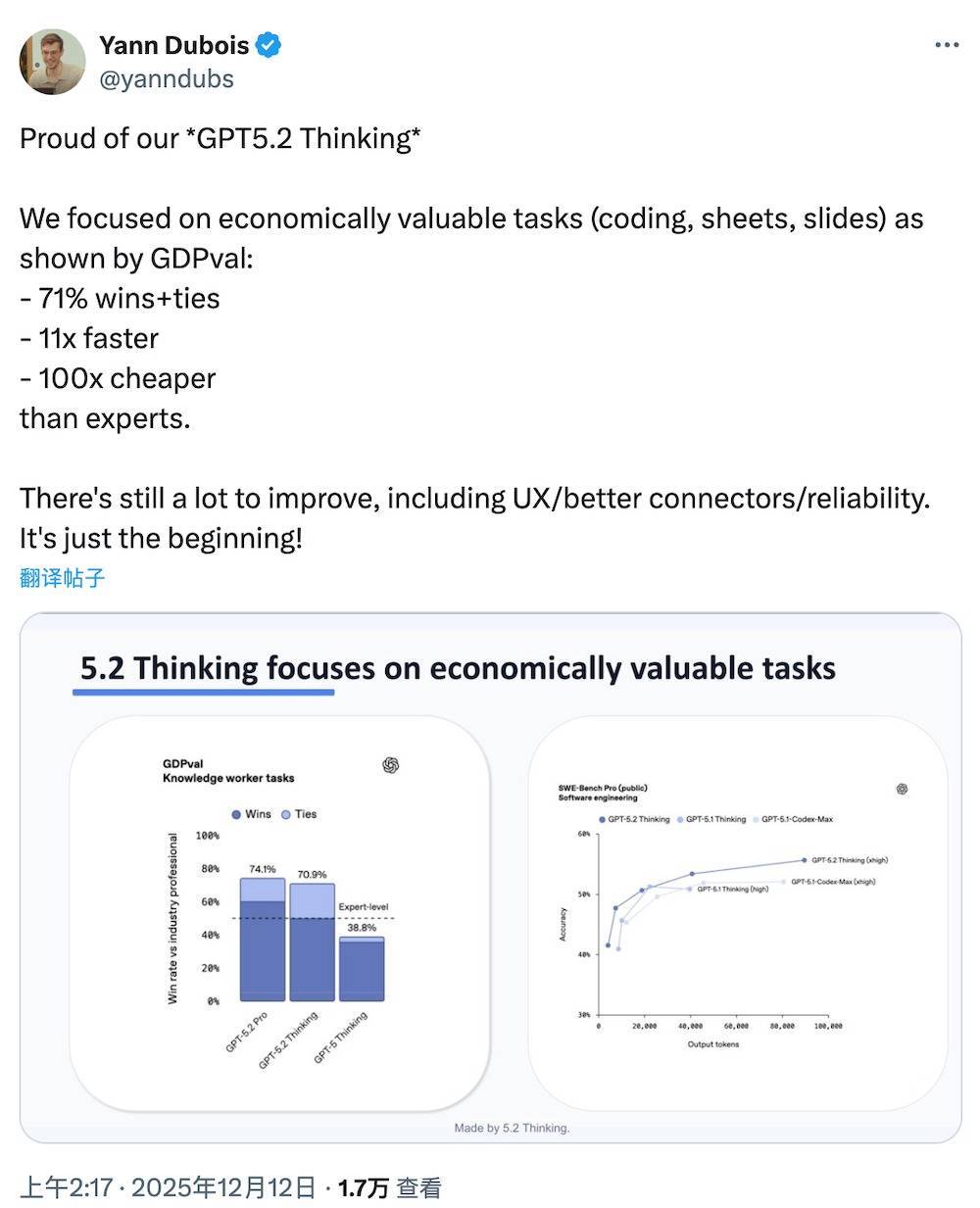 OpenAI团队成员Yann Dubois也在社交平台X平台上发帖称,GPT-5.2 Thinking的设计重点放在“经济价值较高的任务”(如编码、表格与演示文档)。