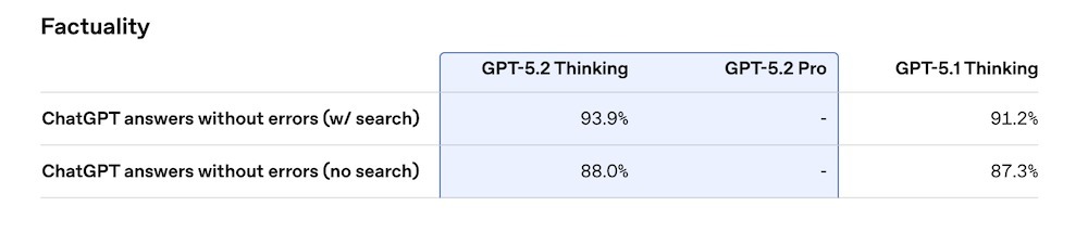 在事实准确性方面,GPT-5.2 Thinking在基于ChatGPT查询的无错误回答率(开启搜索模式下)达到93.9%,较GPT-5.1的91.2%有所改善,在无搜索情况下也从87.3%提升至88%。