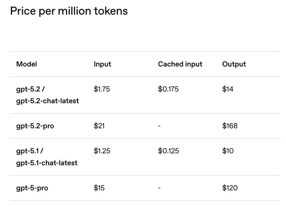 在价格方面,GPT-5.2的调用价格较上一代上调,输入端1.75美元/百万tokens(约合人民币12.35元/百万tokens)、输出端14美元/百万tokens(约合人民币98.81元/百万tokens)。GPT-5.2 Pro的定价为21美元与168美元/百万tokens(约合人民币148元与1185元/百万tokens),并首次支持第五档推理强度xhigh。