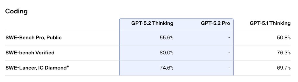 二、代码、工具调用与长链路任务全面升级在代码能力方面,GPT-5.2 Thinking在更严格的SWE-bench Pro(跨四种语言、强调真实工程难度)中取得55.6%,在SWE-bench Verified中更是达到80%,均显著领先GPT-5.1的50.8%与76.3%。在SWE-Lancer IC Diamond任务中,GPT-5.2 Thinking取得74.6%(GPT-5.1为69.7%)。
