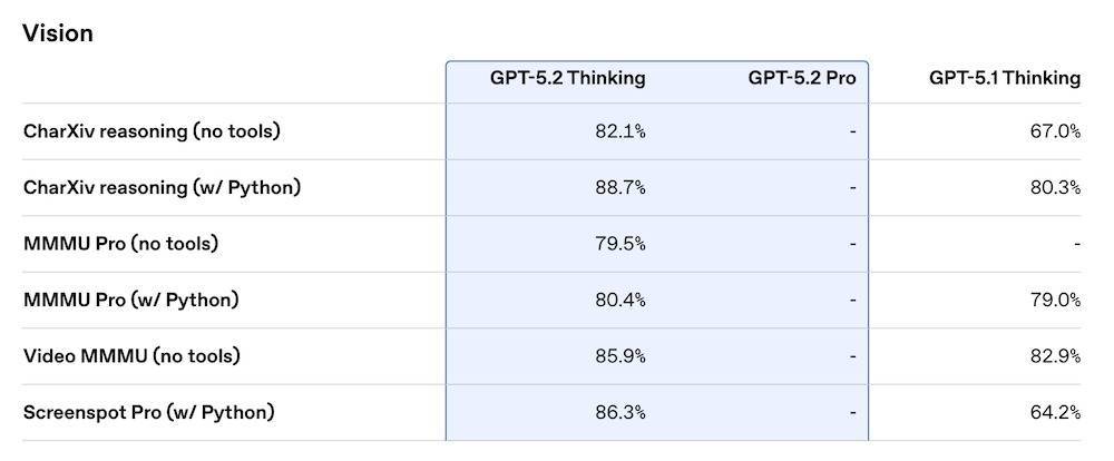 在视觉理解上,GPT-5.2 Thinking在CharXiv科学图表推理任务中无工具模式下为82.1%,开启Python工具后进一步提升至88.7%。在ScreenSpot-Pro界面理解中,GPT-5.2 Thinking取得86.3%,远高于GPT-5.1的64.2%。在视频类、多模态综合难度更高的Video MMMU中,也从82.9%提升至85.9%。